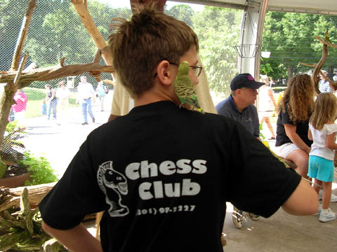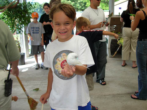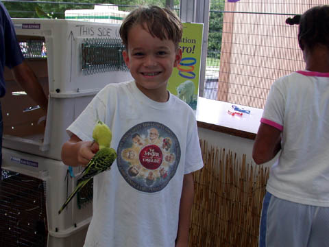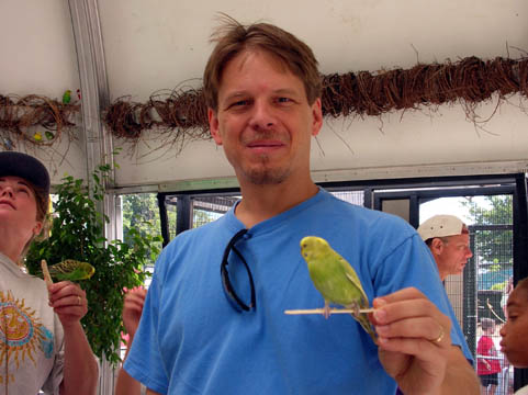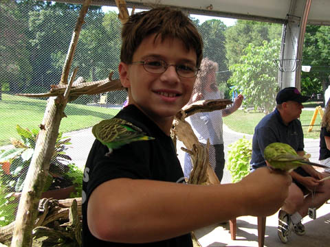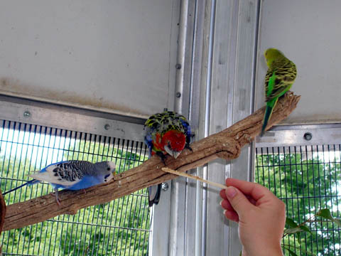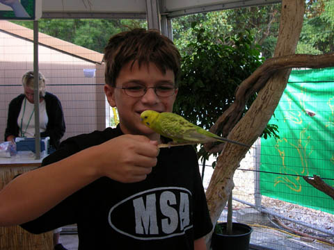 The last weekend for the Parakeet Landing at the Maryland Zoo in Baltimore -- this is a large open-air aviary containing hundreds of parakeets, cockatiels, rosellas and zebra finches which visitors can feed and hold -- something we could not resist, as we used to have parakeets in our pre-cat days and have missed being nibbled by little beaks. The parakeets outnumbered the other birds in both number and attention to humans; most of the cockatiels perched on support struts near the ceiling, while the rosellas preferred to stretch their beaks and snatch seeds rather than land on anyone's shoulders or arms, and the finches mostly stayed hidden in the plants, darting out to pick up fallen seeds and going back into hiding.