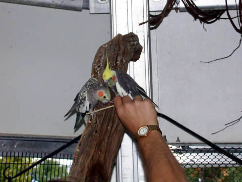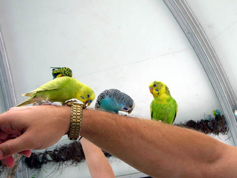 The cockatiels were more wary, climbing down to snitch a bite and then flying up to the metal support beams.