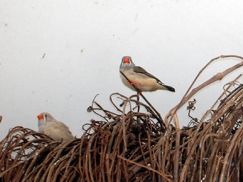 The zebra finches mostly stayed up and out of the way, appearing to pick up dropped seeds from other birds.