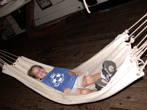 Adam demonstrating the use of the hammock.