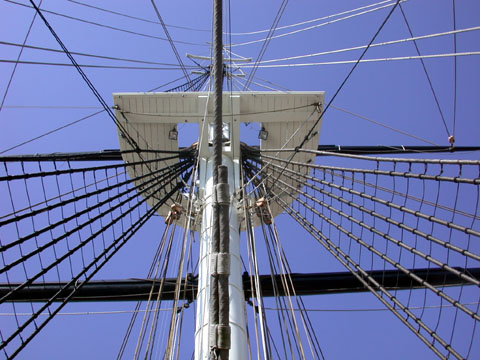 The view overhead from beneath the mainmast on a beautiful day.
