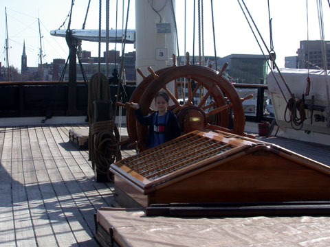 Looking toward the stern with the Maryland Science Center, a church and another tall ship in the background.