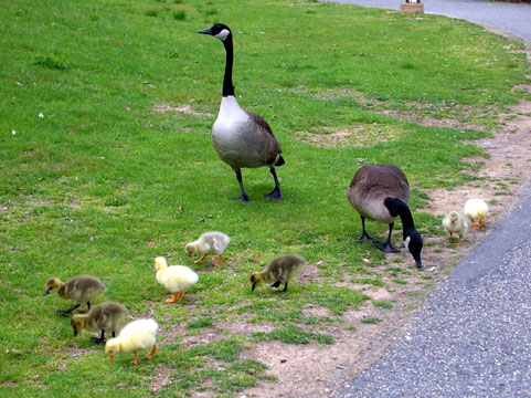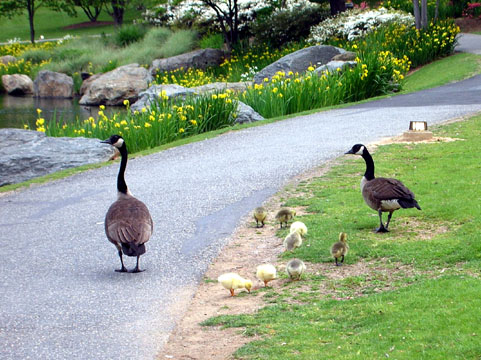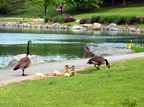 There is an artificial lake behind the multiplex where we see a lot of movies. Before Paul and I saw Kingdom of Heaven, we took a walk and discovered that one of the non-migrating geese had made a nest right in front of one of the restaurants along the boardwalk there. When I went back the next week to see Star Wars: Episode III - Revenge of the Sith, I brought my camera just in case. This is what I saw that day.