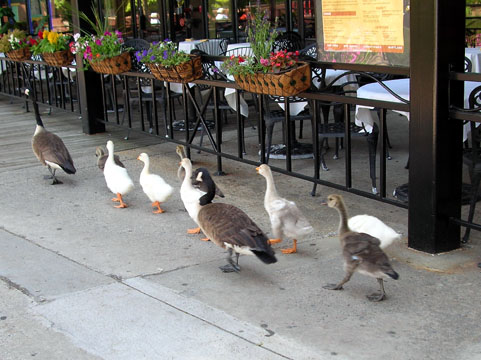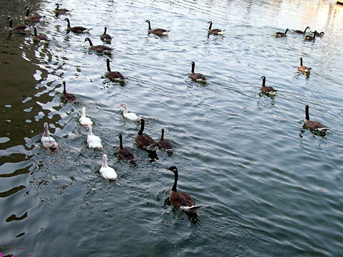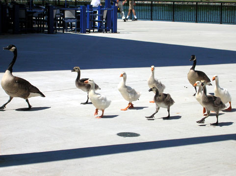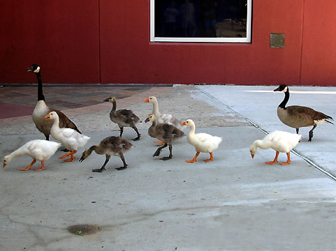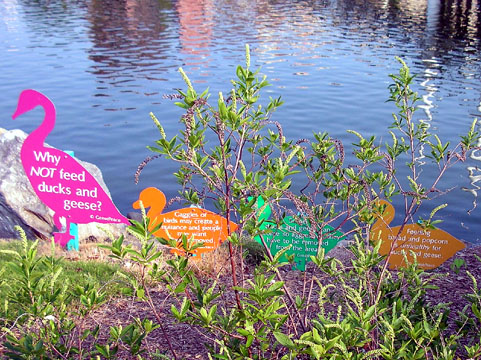 Remember the adorable goslings that live near the multiplex and Barnes & Noble? Well, look what happened! They grew up! I stand by my belief that there has been either cross-species hanky panky, adoption or duckie day care going on. As the summer has gone on and the geese have grown up, it has become apparent that these babies being raised by two Canadian geese are in fact not of the same genetic background. People speculated that a domestic goose either was using the day care services of the more nurturing Canadian goose or had actually laid her eggs in the Canadian goose nest, yet in all my photos of this family, the darkest of the light geese stands out as neither-nor. There are four large white geese that live among the Canadian geese at the office park...they appear to have no children, but they have the same orange bills and feet as the lighter geese here. (And from the bottom sign it appears that some people are concerned about the geese!)