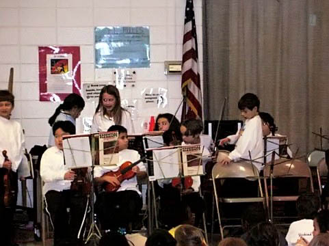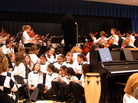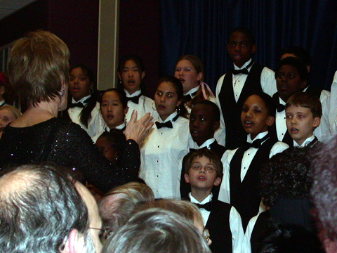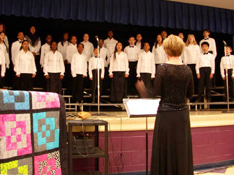 The chorus director, Mrs. Cowart, conducting singers and the string quartet at the middle school winter concert, 2005.