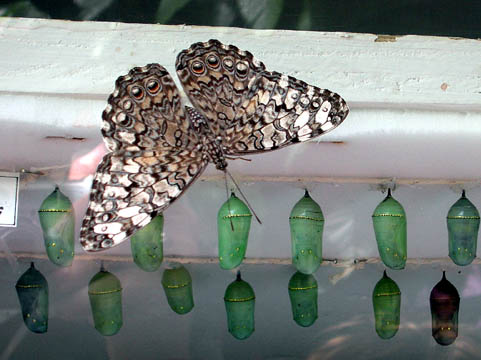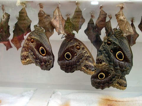 These tawny owl butterflies had just emerged. They hung onto their cocoons for awhile, then tested their legs and eventually flew away.