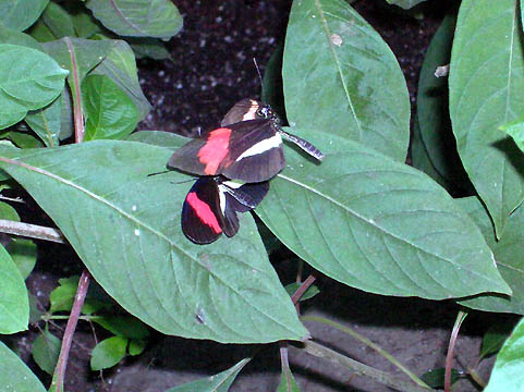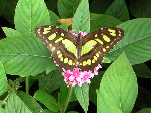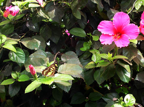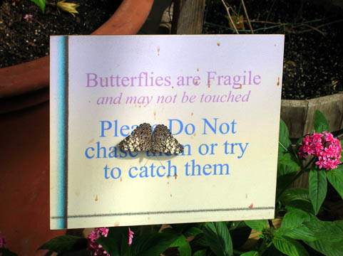 All the butterflies on exhibit were obtained from a butterfly farm. I wonder whether they were taught to pose on the pretty flowers, like this viceroy.