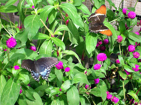 A swallowtail and a black and tan butterfly enjoying the flowers at Brookside Gardens.