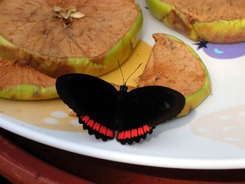 Some butterflies, like this redrim, apparently prefer rotting fruit to live flowers, so there were pieces of apple, strawberry and watermelon in dishes.