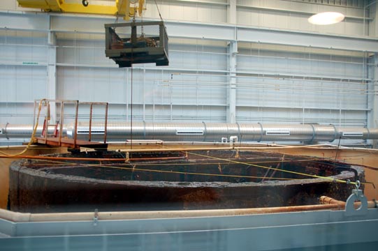 A full-size replica of the turret of the USS Monitor as it looked when it was raised from the ocean floor.
