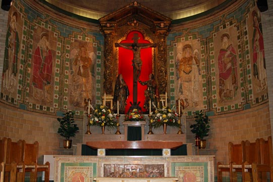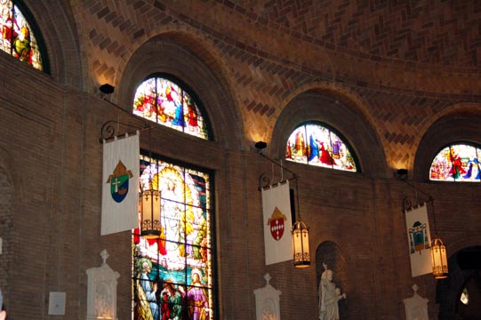 The semicircle windows depict the life of Christ all around the sanctuary, with several larger ones and statues set into the walls.