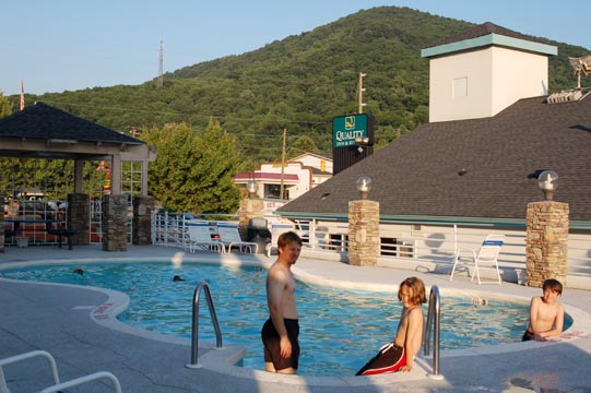 Paul, Daniel and Adam swimming at the hotel with the foothills in the background.