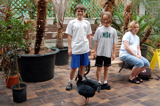 A bird attacks a woman's shoelace in one of the open rooms at the National Aviary.
