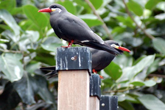 The birds in the flight room are not shy and are happy to sit on railings and posts as well as in the trees.