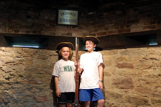 Daniel and Adam in the Block House with one of the garrison's rifles.