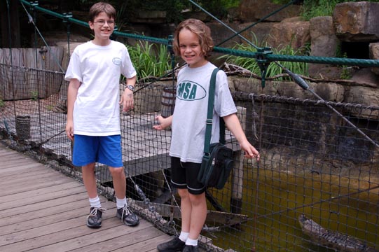 Here are Daniel and Adam on a wooden bridge above an alligator pit.