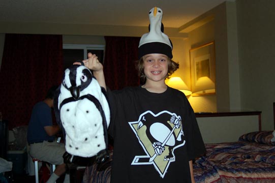 Adam in a hotel room equipped for penguin-viewing with a penguin backpack, hat and Pittsburgh Penguins shirt.