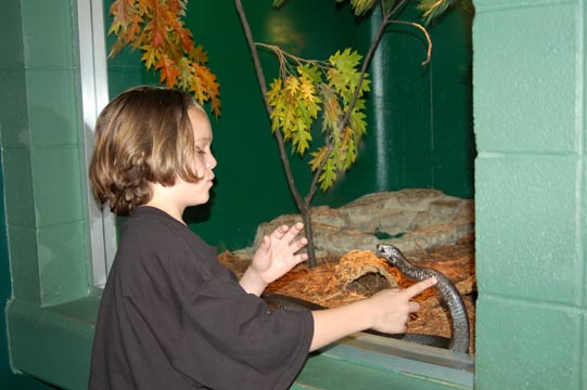 Adam plays Harry Potter and tries to charm a snake out from behind the glass.