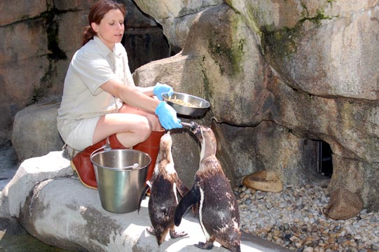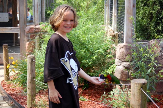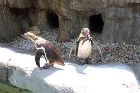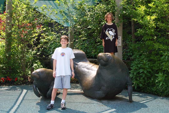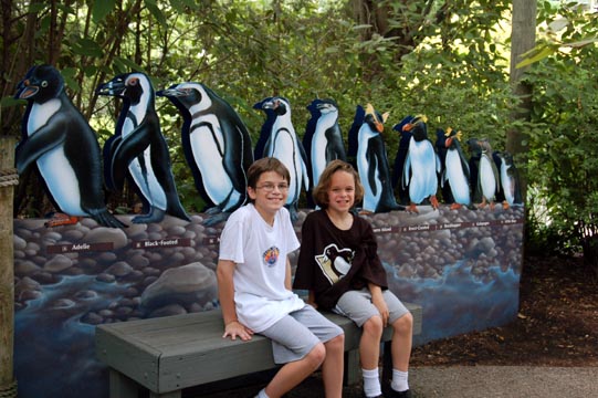 The boys at the African penguin exhibit, with the relative sizes of other penguins.