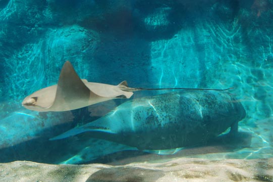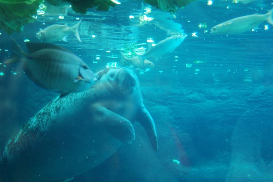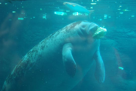 One of the manatees approaches a head of romaine lettuce, which they eat for eight hours a day.