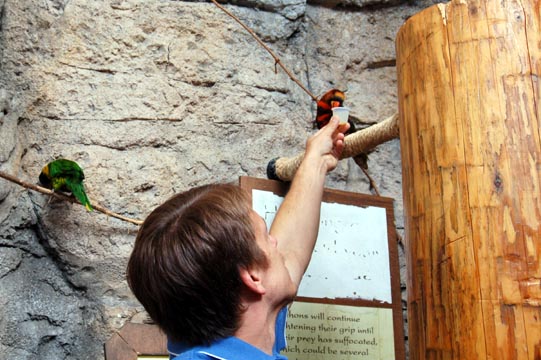 Paul makes friends with a lorikeet. Unfortunately these birds often bite the hand that feeds them.