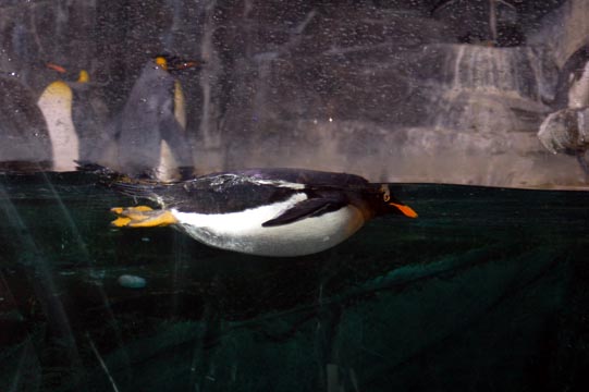 Another Gentoo shows off its swimming skills in front of two indifferent Kings.