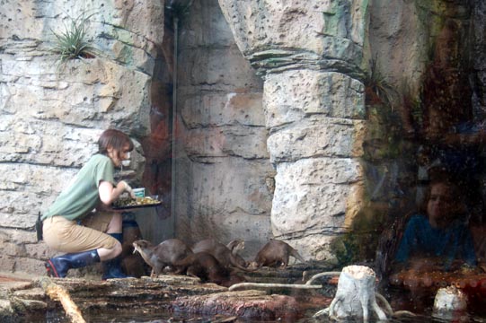 Otter feeding time: one eats a fish after performing, but another must sit and stand on its haunches first.