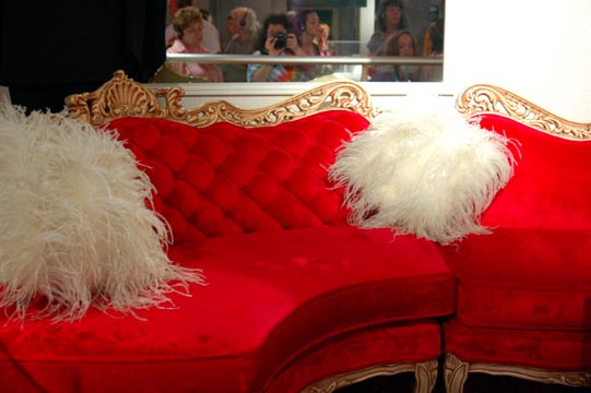 Here you can see me and Adam reflected in the mirror as I take a photo of this lovely red lounge, settled on darker red shag carpet.