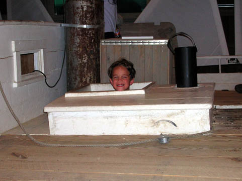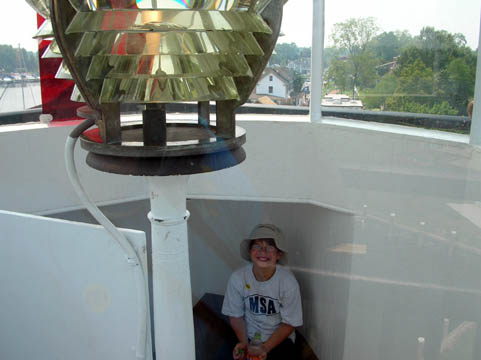 Hooper Strait Lighthouse with Mister Jim docked in front. This yacht, built to look like an oyster buyboat, was built at Richardson's Boat Yard and named for Jim Richardson, for whom the maritime musem in Cambridge is also named.