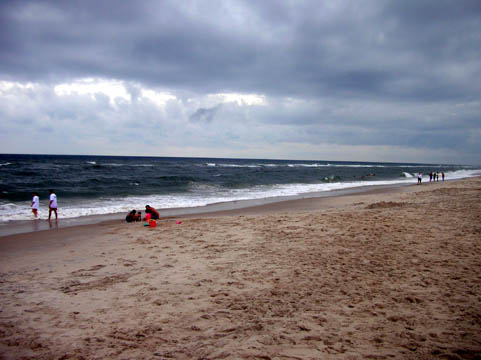 Seabirds digging for mole crabs and clams in the surf of a stormy Atlantic.