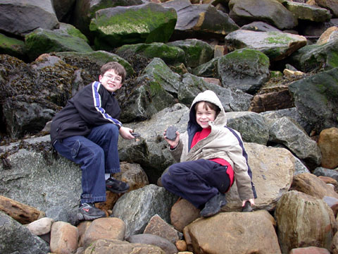 Paul, Adam and Daniel outside an Alice in Wonderland-themed restaurant; note the cobblestone street in the background.