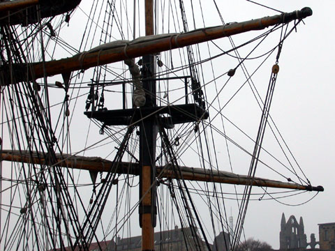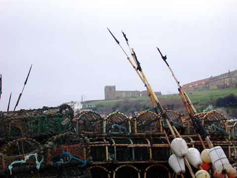 The ruins of the Abbey of Whitby, founded by St. Hilde, from above the sea...