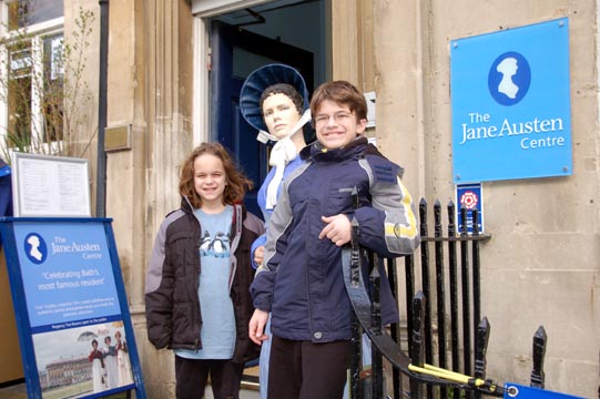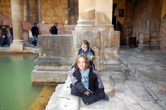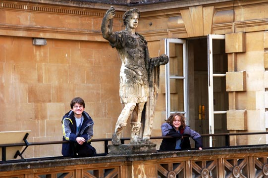 Inside the Roman baths complex, Daniel, Adam and a Roman statue.