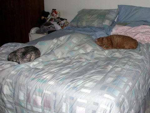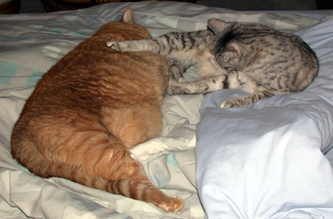 Cats on the bed together, sleeping, cleaning, wrestling...