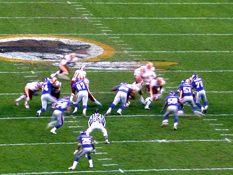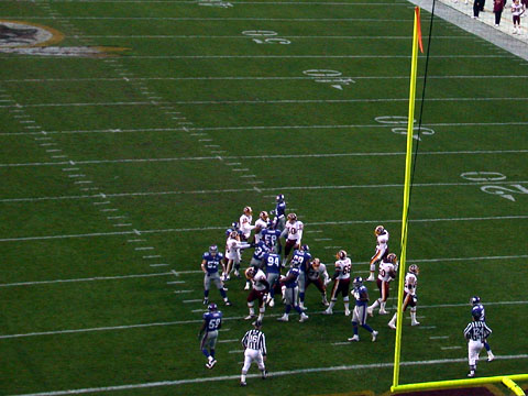 From the Redskins' opening drive against the Giants, Sunday, December 5th, 2004. As you can see, the score was still 0-0. The Giants received the opening kickoff, did nothing for three downs and punted. The Redskins took the ball and marched 95 yards down the field.