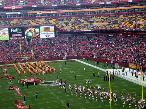 At the start of the game, the team rushed onto the field, surrounded by cheerleaders and serenaded by the band in their godawful fake Indian feather headdresses.