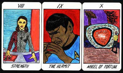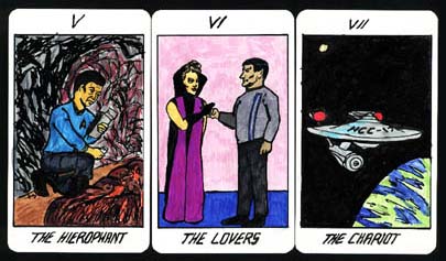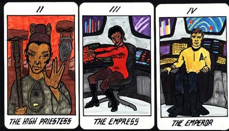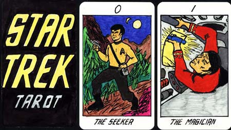 In 1992, my husband made me a Star Trek Tarot deck as an anniversary present, thus combining two of my long-time passions. He illustrated the deck; I chose many of the images for the cards and wrote paragraphs about why I chose the specific Trek images to replace the traditional Tarot archetypes. We hand-colored our deck and sent Pocket Books a copy of the black and white line drawings, but Pocket does not have a card license for Star Trek and Decipher doesn't publish Tarot. Which is a shame, because I would love to write a book with chapters on Tarot card history and interpretation, Star Trek archetypes, how to use the cards as psychological tools and some examples of Trek-specific spreads like The Comm Badge or the IDIC.