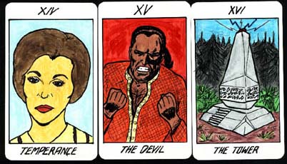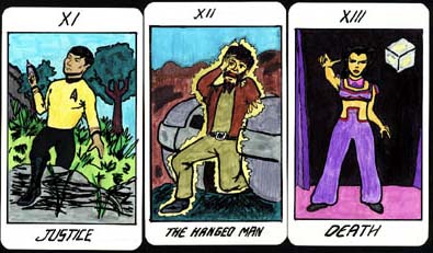 The cards are approximately 2.5 x 5" as is standard for many Tarot decks. Because this deck was entirely based on the original series, we were able to illustrate an element from every episode. I wrote notes on all 78 cards in the Major and Minor Arcana. The characters and scenarios from Star Trek are all trademarks of Paramount Pictures. The graphics and text on this page are copyright Paul Anderson and Michelle Erica Green, 1992. They have never been distributed or sold for profit. If you wish to save the images for your own amusement, that's fine, but do not print, repost or adapt and create your own deck based on this template.