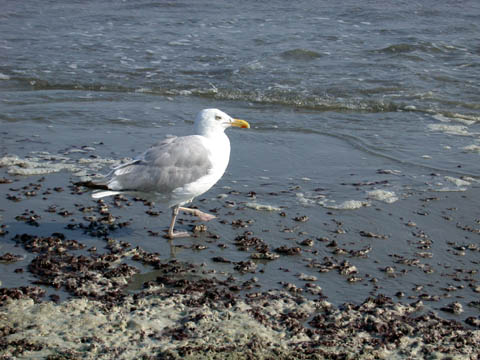 This is because the water is full of this red seaweed that dozens of happy gulls were devouring when it washed up on shore. We thought at first that the appeal must have been bits of the crabs and large clams whose shells we found...