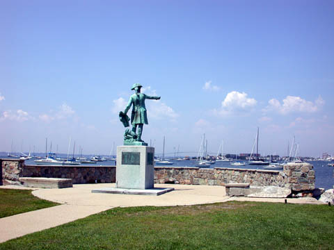 Rochambeau, in effigy, overlooking Narragansett Bay, the boats and the bridge connecting Newport to the rest of Rhode Island.