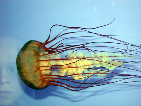 A jellyfish and Adam's reflection at the New England Aquarium. We came here in part to see Prisoner of Azkaban on the IMAX screen, which was also amazing...partly because I noticed things in Lupin's office and the Great Hall and Hagrid's hut that I had never been able to see before, and partly just because the experience is so all-encompassing with that kind of sound and scope that it feels less like being in a theater and more like being in the movie -- flying a hippogriff and riding a broom!