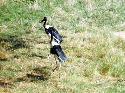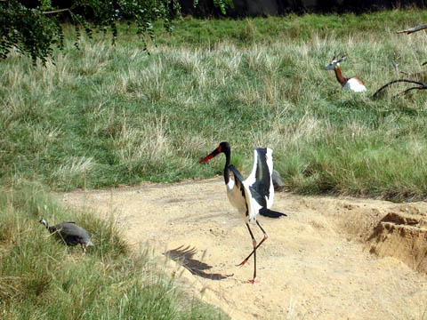 A saddle-billed stork chases away a peafowl as a disinterested gazelle watches.