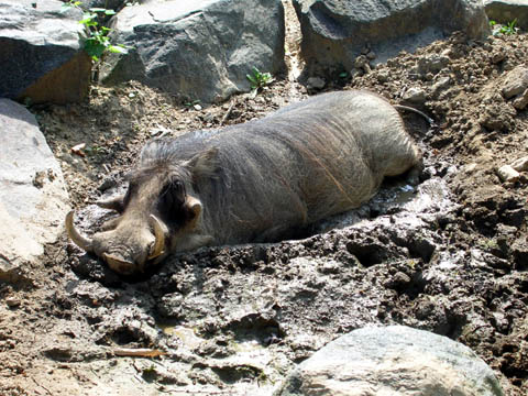 Sleepies at the Zoo. Now this is the life! A warthog snores in the mud.
