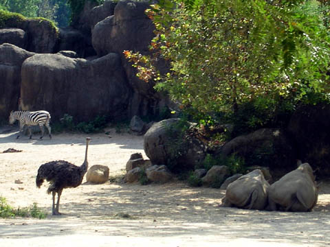 An ostrich stands amidst zebra and rhinos in the African plains exhibit.