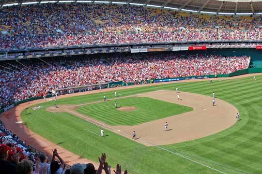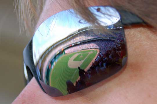 The field at RFK Stadium reflected in Paul's sunglasses. We went to the Nationals home opening game, where they went from playing badly to playing terribly while the Mets either played pretty well (David Wright drilled a perfectly hit ball down the third base line to bring home the first run of the game) or took advantage of some mediocre pitching by Ramon Ortiz. In the end, the score was 7-1, though we were gone before the final two runs in the ninth inning, having seen no evidence that the Nats had any hope of a comeback.