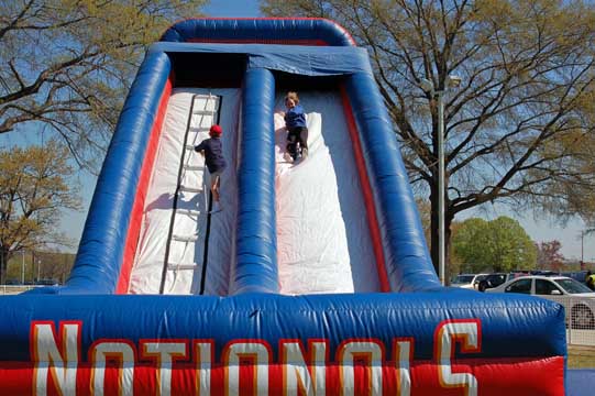 That said, it was a fun day: inflatable slides, moon bounces, batting cages and obstacle courses sponsored by local radio stations before the game on a perfect sky-blue 70ish degree day, then peanuts, cheese fries and chicken nuggets waiting for the game to start. Here Adam comes down the inflatable slide at the fun fair.