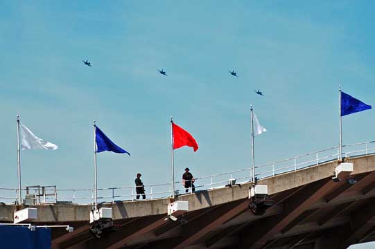 During the pre-game festivities, fighter jets fly in formation over RFK Stadium.