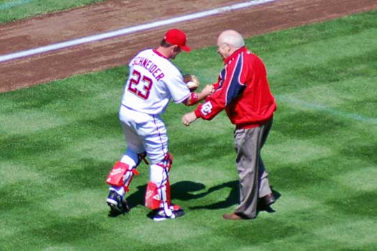 Dick Cheney receives his ceremonial baseball after throwing his ceremonial pitch into the ceremonial dirt. He came out to more boos than applause, threw the ball into the dirt and left to even more boos, despite having brought three veterans from Iraq wounded in the line of duty with him. They got a standing ovation, but not Dick.
