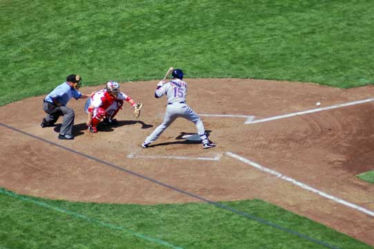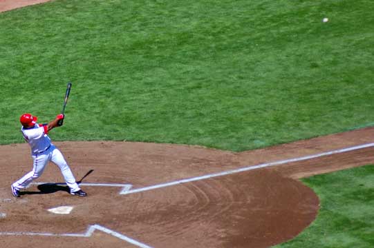 And this shot, taken with the telephoto, shows the ball flying foul off the bat. Now, the ball was probably not traveling very fast since it was popping up and headed above the stands, but I was impressed that the lens caught it so close and so clearly anyway.