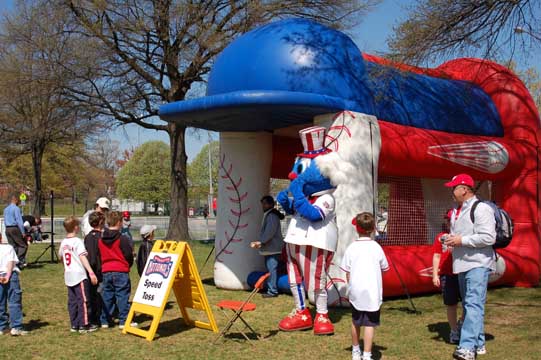 And here kids wait with the mascot for a turn at the speed toss (where nearly all of them did better than Vice President Dick Cheney throwing out the ceremonial first pitch).